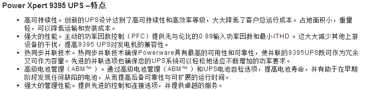 Power Xpert 9395UPS,結(jié)合技術(shù)創(chuàng)新,提供豐富功能。為大型數(shù)據(jù)中心,醫(yī)療設(shè)施和其他核心系統(tǒng)提供高功率密度的一流電源保護。高系統(tǒng)效率顯著降低運行費用。雙轉(zhuǎn)換拓撲結(jié)構(gòu)使得可靠性萬無一失,同步并聯(lián)技術(shù)確保能夠滿足當前和未來電力需求。
